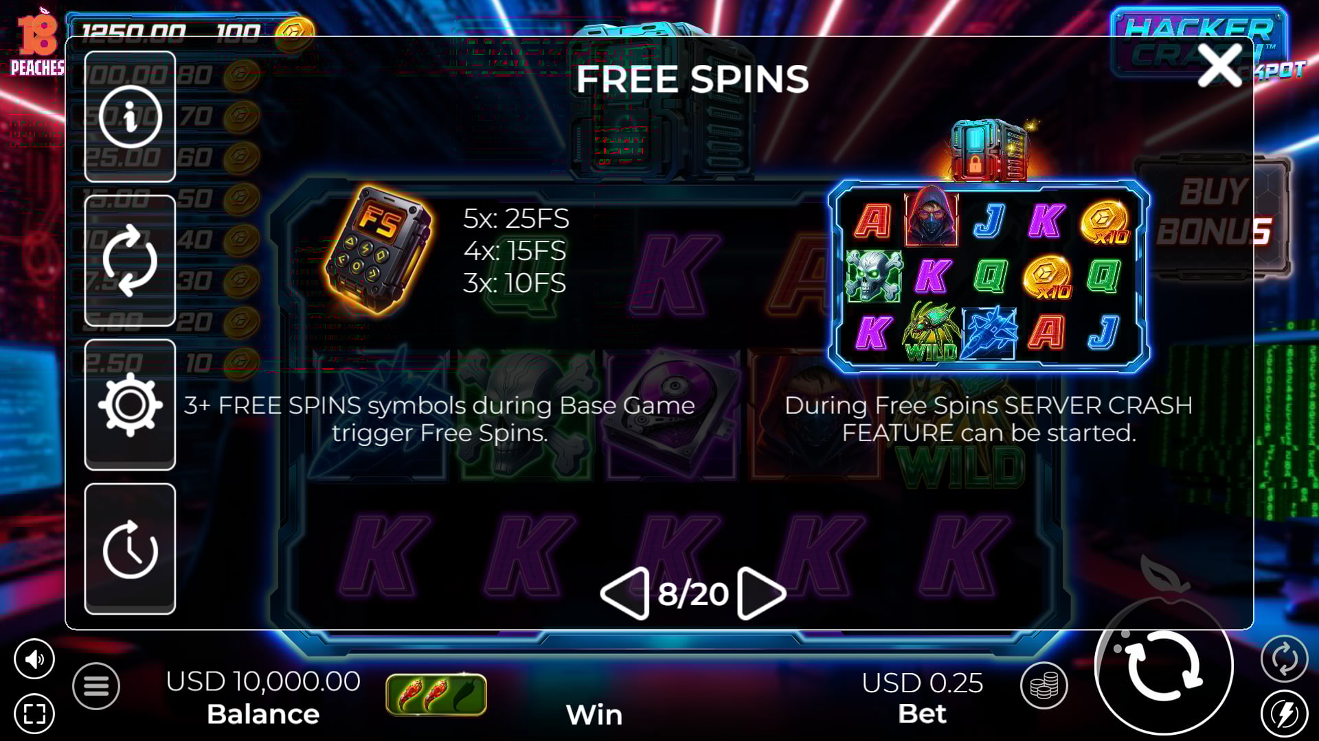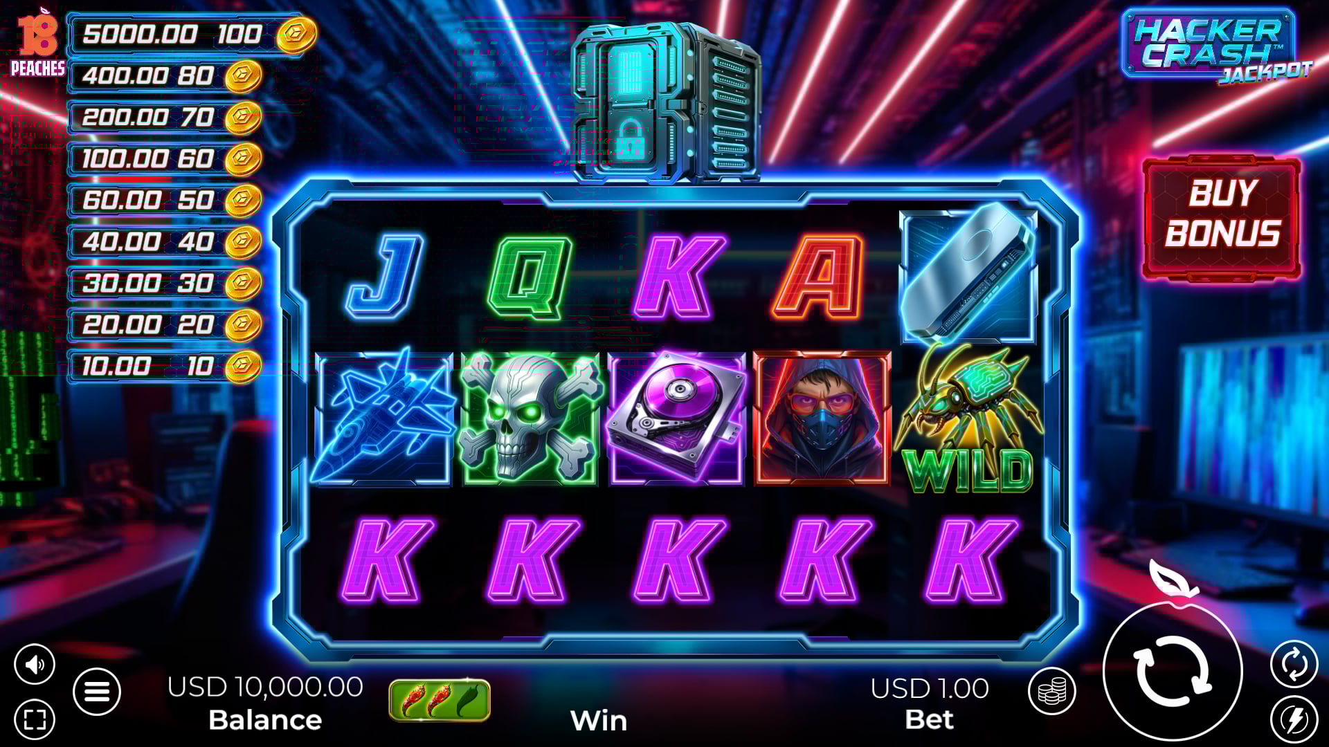 Welcome to the mysterious **Hacker Crash Jackpot**, a slot where seemingly anything can happen on any given spin. Created by software provider **18Peaches**, this casino game is played across a 5x3 reel grid and features 243 different ways to win. It’s a medium-volatility slot with a respectable 96% RTP, which ensures that players will get plenty of bang for their buck on each and every spin.