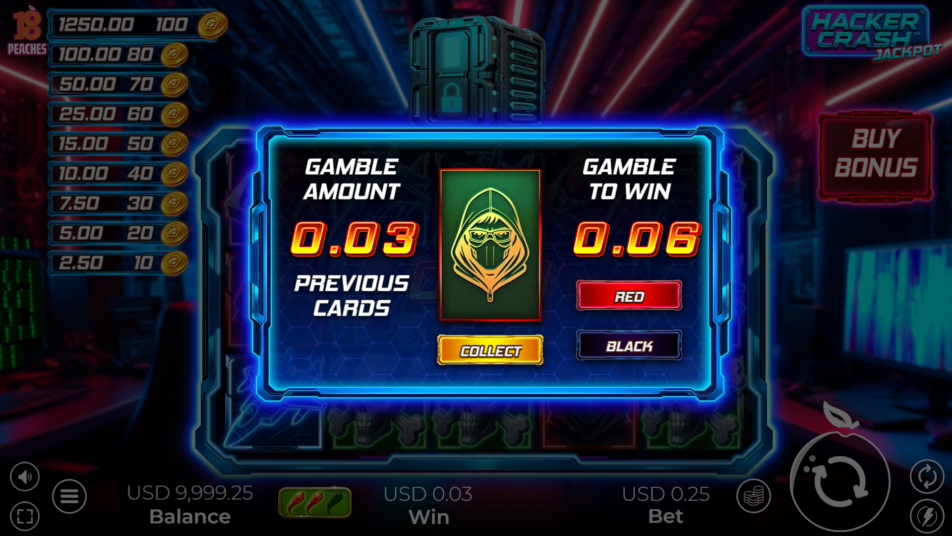 As is the case for many casino games these days, **Hacker Crash Jackpot** is equipped with a gamble feature, which gives players a chance to double their winnings after any winning spin. In order to do so, they simply need to correctly guess whether the card shown will be red or black. This can be done up to two times, but if your guess is incorrect, you’ll forfeit your winnings.