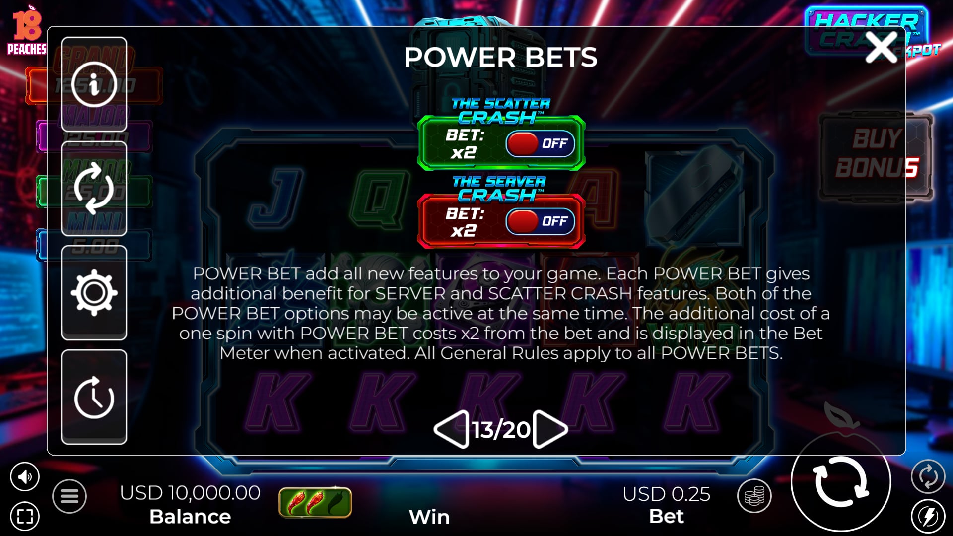 For players who like an extra advantage while playing, **Hacker Crash Jackpot** is equipped with power bets, which are essentially additional bets that provide different enhancements whenever the scatter crash or server crash bonus rounds are triggered. The power bets increase your total wager by 2x respectively, but as a result only 4 symbols are needed to start the scatter crash feature and you begin with 4 respins instead of 3. Similarly, 4 respins are awarded at the start of the server crash bonus round instead of 3.