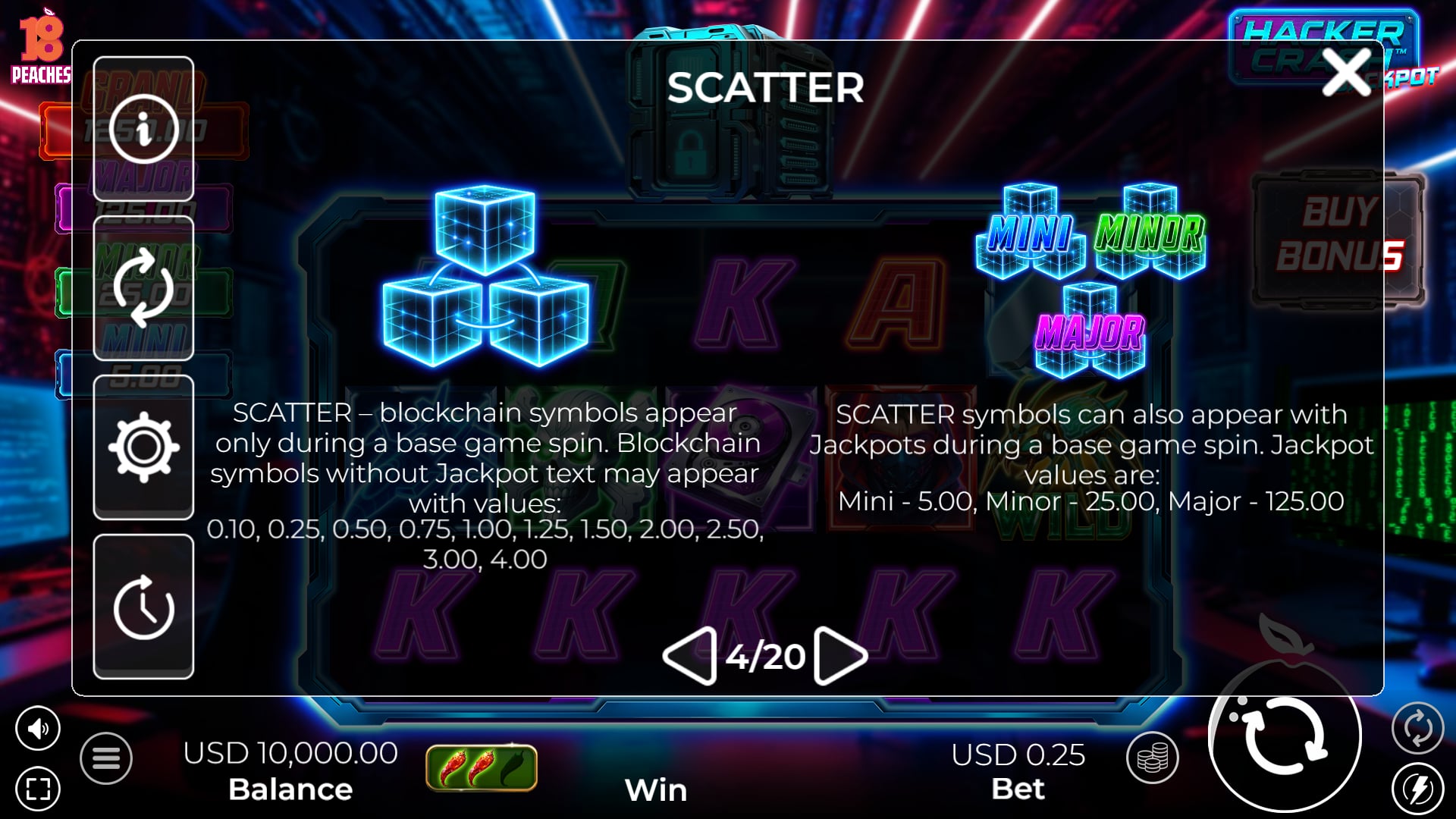 One of the first things to keep an eye out for while playing **Hacker Crash Jackpot** are the game’s scatter blockchain symbols. That’s because these symbols can carry values ranging form 0.4x to 16x, but they can also carry mini, minor, and major jackpot values of 20x, 100x, and 500x respectively.