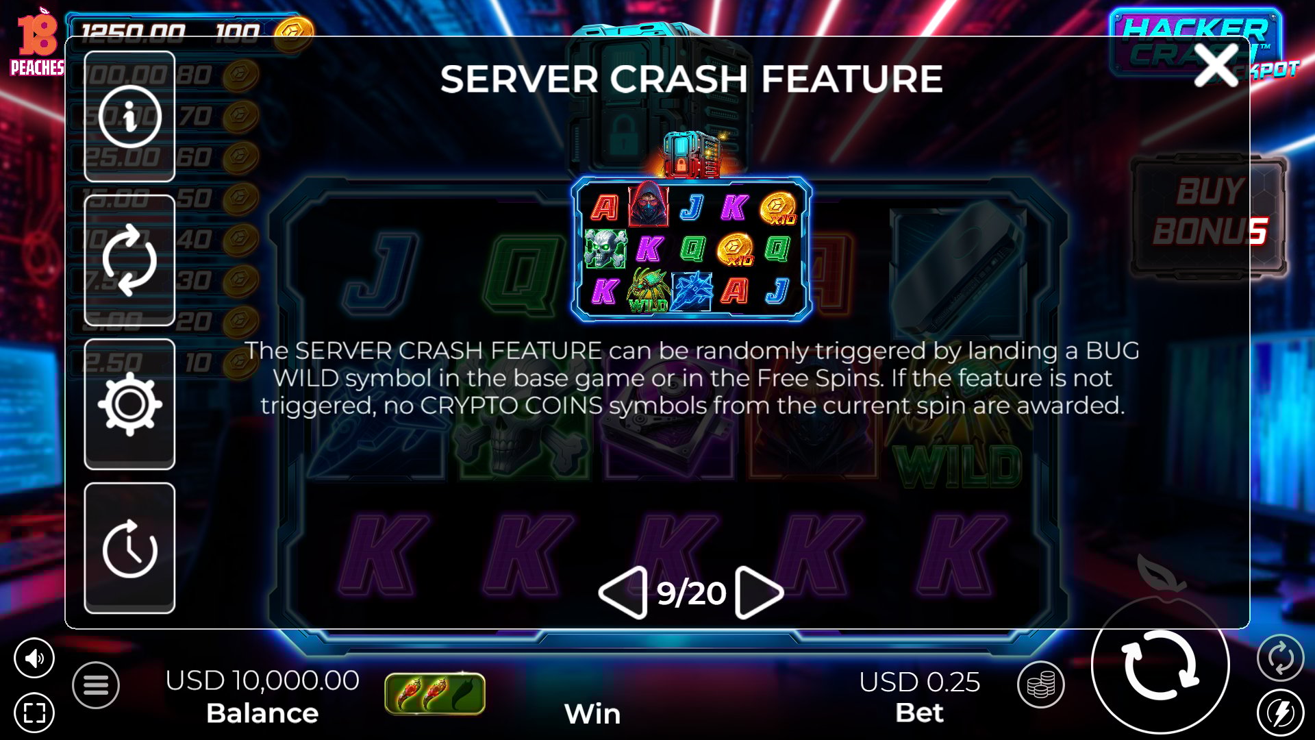 The server crash feature can be randomly triggered in the base game as well as in the free spins bonus round by landing a wild bug symbol anywhere on the reels. This bonus round is played on a reel grid with 15 positions, where the goal is to land crypto coins on the 15 positions. At the start of this feature, any crypto coins landed during the triggering base game spin are transferred to the bonus round along with their multipliers.